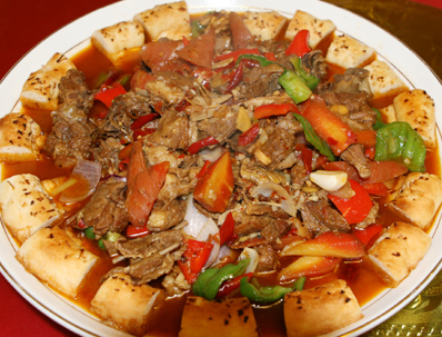 新疆的烤羊肉串可以說是風(fēng)靡全國(guó)的一種風(fēng)味小吃,受到了廣大群眾的青睞。為了使烤肉串更加方便衛(wèi)生,能被更多的人接受,也為了盡早使本小吃走出本土,清真師傅們則將烤的方法改為炒,炒出的烤肉同樣鮮嫩,滋味醇厚。炒烤肉最初的起源是將幾十串烤好的羊肉串置于馕上,然后抽去鐵簽,味道異常鮮美。后來逐步演變?yōu)槌粗瞥鼍哂醒蛉獯L(fēng)味的這道菜。它既是新疆的一道名菜,同時(shí)也是一種典型的風(fēng)味小吃品種。