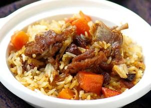 黃蘿卜是抓飯之核心,俗有“新疆人參”之稱,很多人稱它為“地參”,藥理上具有補(bǔ)氣生血、生津止渴、安神益智之功效。洋蔥,新疆人稱為皮芽子,也是抓飯中必不可少的一種調(diào)味品,藥理上講,它具有祛風(fēng)、發(fā)汗、解表、消腫,治感冒風(fēng)寒、頭痛鼻塞、中風(fēng)、面目浮腫、痢疾之功效,據(jù)現(xiàn)代科學(xué)證明,洋蔥還具有溶解血栓的功用。新疆的穆斯林群眾將這幾種食物配料進(jìn)行有機(jī)組合后,就成了一種滋補(bǔ)性極強(qiáng)的飯食,因此有一些人稱新疆的抓飯為“十全大補(bǔ)飯”。