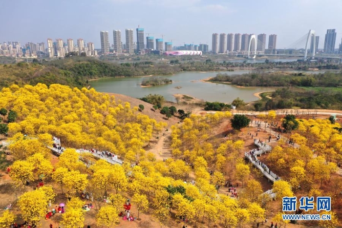 2月21日,游人在南寧市青秀山風(fēng)景區(qū)觀賞盛開的黃花風(fēng)鈴木(無人機(jī)照片)。