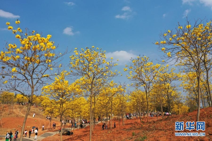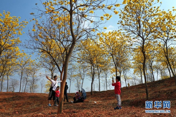 近日,廣西南寧市青秀山風(fēng)景區(qū)黃花風(fēng)鈴木盛放,吸引眾多游人前來觀賞。