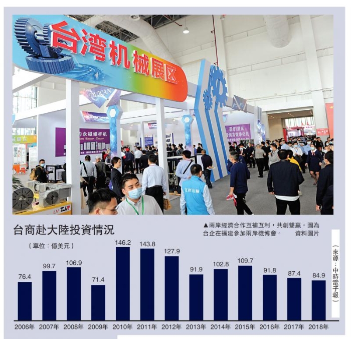 圖:兩岸經(jīng)濟(jì)合作互補(bǔ)互利,共創(chuàng)雙贏。圖為臺(tái)企在福建參加兩岸機(jī)博會(huì)。\資料圖片