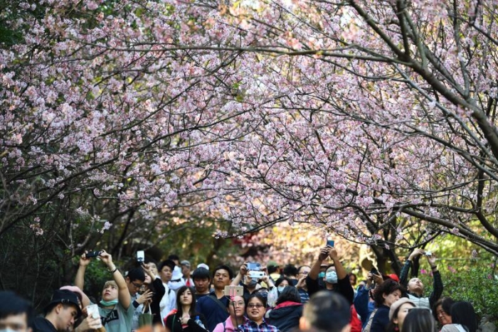 圖:臺北市內湖區(qū)山區(qū)的碧山巖近日正值櫻花綻放期,吸引了不少賞花人潮。\臺“中央社”