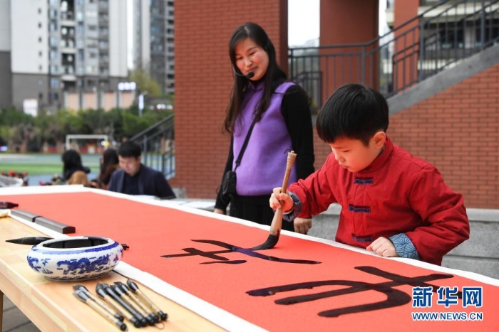 3月1日,重慶兩江新區(qū)青禾童心小學(xué)學(xué)生在開學(xué)典禮上寫書法。