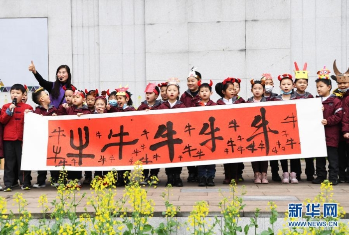 3月1日,重慶兩江新區(qū)青禾童心小學(xué)學(xué)生在開學(xué)典禮上展示現(xiàn)場書寫的書法作品。