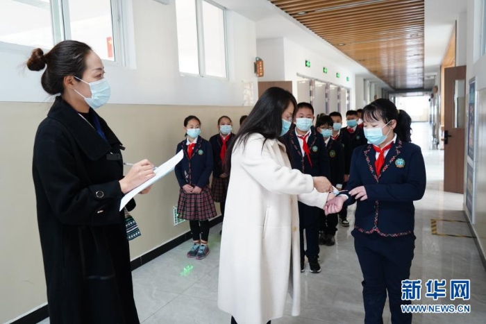 3月1日,在青海省格爾木市中山路小學(xué),老師為學(xué)生測量、記錄體溫。新華社記者 藍(lán)翔 攝