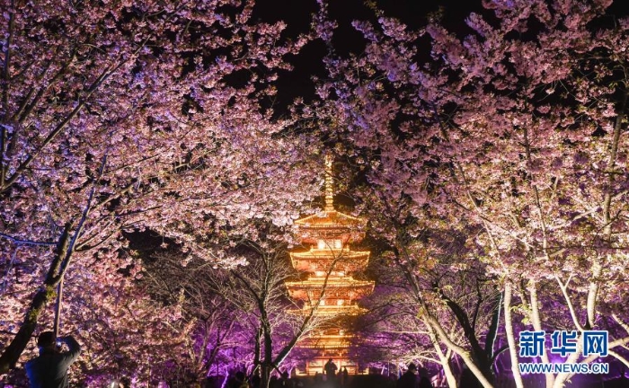 這是3月3日拍攝的武漢東湖櫻花園夜景。