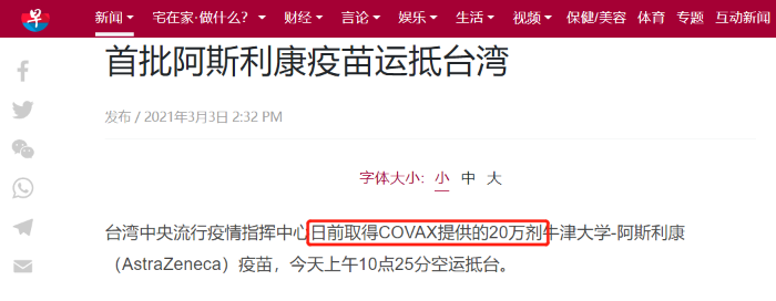 除了疫苗來源外,該消息的另一個(gè)爭議點(diǎn)則是首批抵臺疫苗的總數(shù)。新加坡《聯(lián)合早報(bào)》的報(bào)道中沿用了疫苗來自COVAX平臺的說法,并表示這批疫苗的總劑量是20萬劑,而不是臺灣“中央社”和RFI所寫的11.7萬劑。