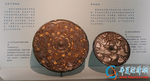 圖左為唐代羽人花鳥紋金銀平脫葵式銅鏡,圖右為唐代高士宴樂紋嵌螺鈿銅鏡(攝影:虞鷹)