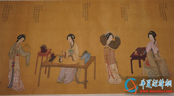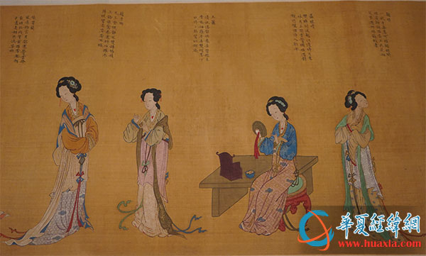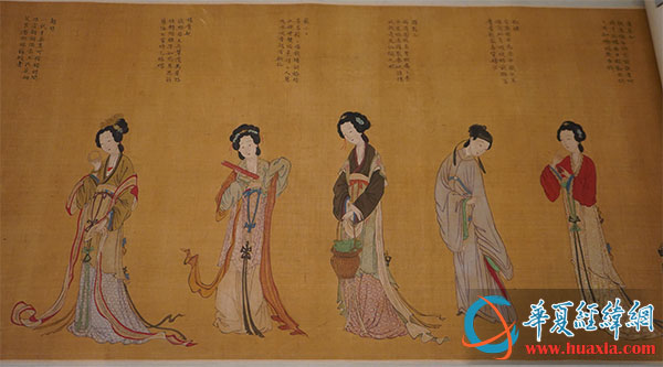 本次展覽,畫卷局部展出了蓮花女、西施、楊貴妃、蘇小小、聶勝瓊等著名仕女的形象,并配詩做解,生動地描繪了仕女們的生平。比如:描寫蓮華女“朝來獨(dú)自倚窗前,試看何時(shí)了此緣。每日殷勤思問卜,不知擲破幾多錢?!泵鑼懳魇拔魇┪羧珍郊喗颍锨嗵λ?xì)⑷?。一去蘇臺不復(fù)返,岸傍桃李為誰春?!泵鑼懱K小小“芳名籍籍滿錢塘,詞翰精工絕世雙。冶色涓涓人莫及,水沉香起看新妝?!泵鑼懧檮侪偂半p眸別淚越江邊,待月東林月正圓。云鬢懶梳還對鏡,恐驚憔悴入新年?!?/p>