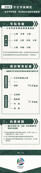 吳謙:新的軍官制度對(duì)軍官等級(jí)設(shè)置作出重大改革,由基于職務(wù)等級(jí)調(diào)整為基于軍銜等級(jí)。新的軍官軍銜設(shè)“三等十銜”,將官分為上將、中將、少將,校官分為大校、上校、中校、少校,尉官分為上尉、中尉、少尉。軍官軍銜按照軍種劃分種類,在軍銜前冠以軍種名稱。指揮管理軍官和專業(yè)技術(shù)軍官的軍銜,分別標(biāo)識(shí)。