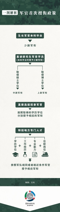 吳謙:此次軍官制度改革,調(diào)整了軍官首次授銜政策。主要變化是,生長(zhǎng)軍官本科畢業(yè)的授予少尉軍銜;對(duì)直讀研究生軍官學(xué)員,本科畢業(yè)時(shí)授予少尉軍銜,研究生畢業(yè)取得碩士、博士學(xué)位的,分別晉升為中尉、上尉軍銜;對(duì)直接選拔招錄的軍官,按照取得的學(xué)歷學(xué)位,分別授予相應(yīng)的軍銜;對(duì)特招地方專門人才擔(dān)任軍官的,綜合衡量其學(xué)歷學(xué)位、工作經(jīng)歷、專業(yè)能力和任職崗位等因素,參照軍隊(duì)相同或者相近條件軍官,授予相應(yīng)的軍銜。