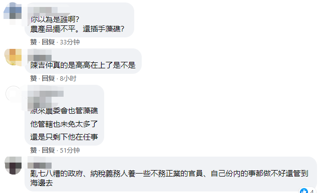 島內(nèi)網(wǎng)友也紛紛留言質(zhì)疑,“農(nóng)產(chǎn)品擺不平,還插手藻礁?”、“自己份內(nèi)的事都做不好還管道海邊去”、“原來(lái)藻礁算農(nóng)產(chǎn)品”……