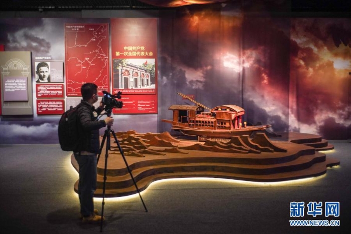 3月9日,一名記者在首都博物館展廳內(nèi)拍攝浙江嘉興南湖紅船模型。新華社記者 彭子洋 攝