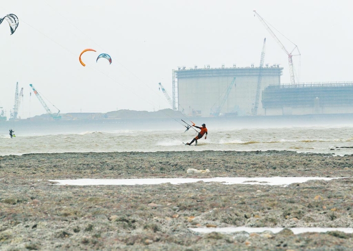 圖為興建中大潭天然氣儲存槽旁的新藻礁保護區(qū)水域,現(xiàn)成為風箏沖浪愛好者沖浪的圣地。(陳怡誠攝)