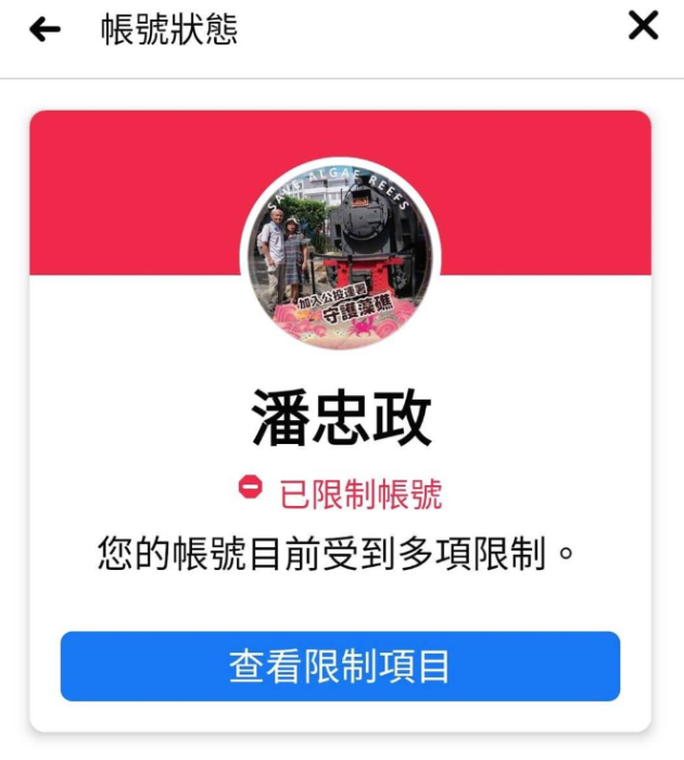 社交賬號受到多項限制,潘忠政不解。(圖片來源:臺灣《中時電子報》)