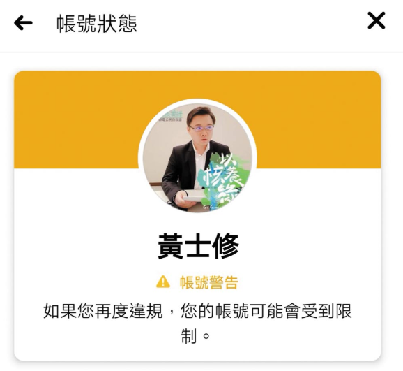 今年2月底黃士修因為發(fā)表公開聲援藻礁聯(lián)署的文章,結(jié)果被檢舉成“賬號警告”;臉書也警告:若再發(fā)表觸犯社群守則的言論,賬號功能就會被限制。