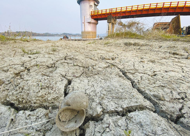 高雄供水吃緊,圖為阿公店水庫露出干涸地表。(圖片來源:臺灣“中央社”)