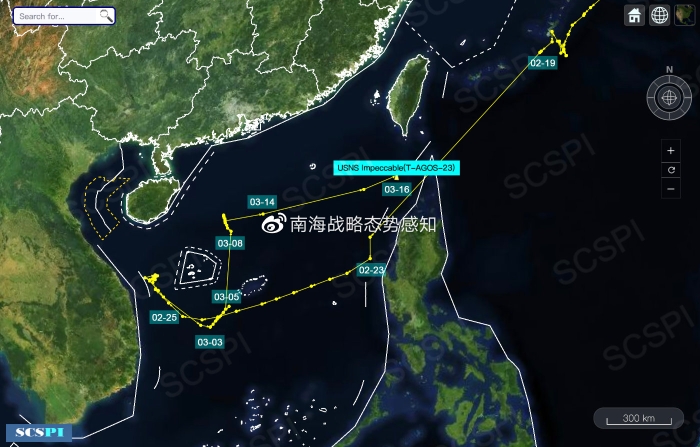 2月底至3月9日,“無瑕”號測量船一直在西沙群島附近活動,從西沙群島的南部海域折向正西方向,而后再返回,隨后往正北方向航行,軌跡呈現(xiàn)一個不規(guī)則的半圓型,顯然是在針對中國西沙群島及海南島附近的目標(biāo)。