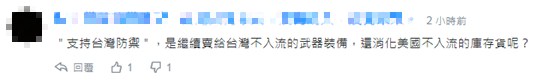 不過,對于希拉里“支持臺灣防御”的說法,有網友諷刺,“‘支持臺灣防御’,是繼續(xù)賣給臺灣不入流的武器裝備,還(是)消化美國不入流的庫存貨呢?”