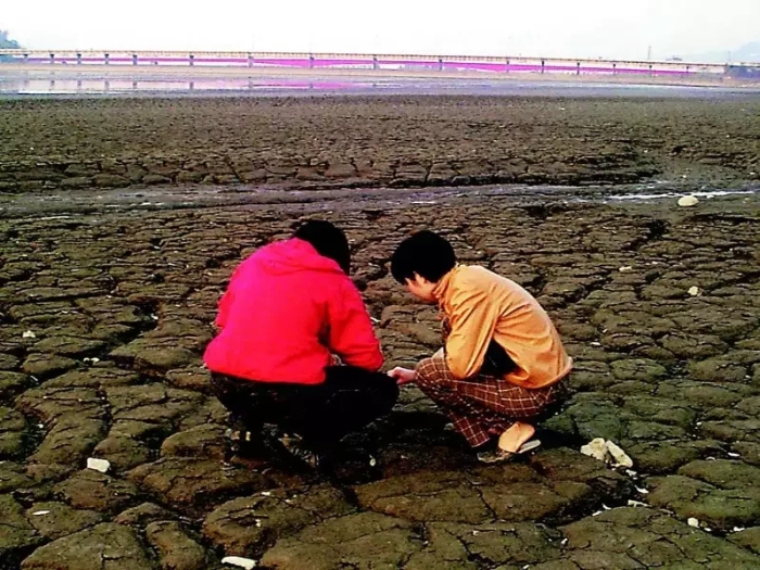 圖為2002年,石門水庫缺水嚴重,干涸龜裂,春節(jié)期間,民眾甚至下庫玩耍,變成春節(jié)一景。