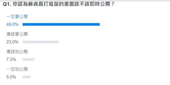 根據(jù)一份最新民調(diào)顯示,有超過7成網(wǎng)友認(rèn)為蘇貞昌應(yīng)公開施打疫苗時(shí)的實(shí)時(shí)畫面,而蘇貞昌帶頭施打,是否會(huì)讓民眾放心接種,有超過4成網(wǎng)友認(rèn)為不會(huì)。