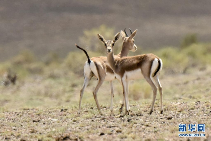 兩只鵝喉羚在新疆卡拉麥里山有蹄類野生動(dòng)物自然保護(hù)區(qū)四處張望(2020年6月6日攝)。新華社記者 丁磊 攝