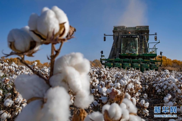 采棉機(jī)在新疆阿克蘇地區(qū)沙雅縣的一處棉田進(jìn)行采收作業(yè)(2020年10月23日攝)。新疆是我國最大的棉花產(chǎn)區(qū),2020年新疆棉花產(chǎn)量達(dá)516.1萬噸,占全國棉花總產(chǎn)量87.3%。新華社記者 胡虎虎 攝