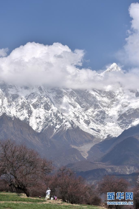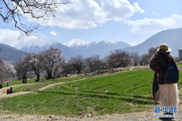 3月28日,游客在西藏自治區(qū)林芝市索松村欣賞與雪山相映的桃花。新華社記者 孫瑞博 攝