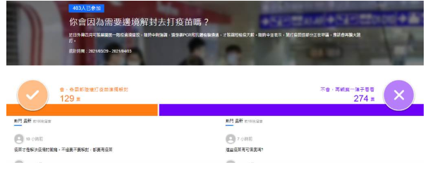 ?對于疫苗開打后,外傳四月可能展開第一階段邊境開放,陳時中響應(yīng),還要PCR和抗體檢驗(yàn)通過,才能縮短檢疫天數(shù)。入口網(wǎng)站《Yahoo奇摩》29日就對此發(fā)起網(wǎng)絡(luò)投票民調(diào),以“你會因?yàn)樾枰吘辰夥馊ゴ蛞呙鐔???”為題詢問廣大網(wǎng)友看法,投票時間為3月29日至4月3日,截至29日下午10時30分為止,共有400多名網(wǎng)友投票,列出2個選項,表示“不會,再觀察一陣子看看”,比例為67.9%、有274票,表示“會,各地都陸續(xù)打疫苗準(zhǔn)備解封”比例為32.1%、有129票。