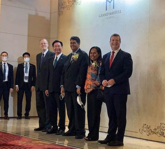吳釗燮宴請帕勞總統(tǒng)薩蘭格爾·惠普斯夫婦,美國駐帕勞大使倪約翰、AIT處長酈英杰出席發(fā)表聯(lián)合談話。(圖片來源:臺灣《中時電子報》)