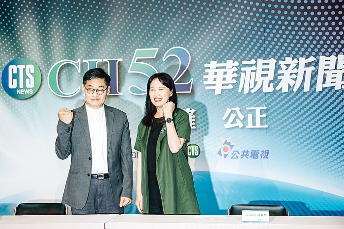 NCC 通過(guò)15系統(tǒng)申請(qǐng)華視新聞信息臺(tái)遞補(bǔ)52臺(tái)案件,確定華視進(jìn)駐52臺(tái),昨日華視總經(jīng)理莊豐嘉(左)與公視代總經(jīng)理徐秋華(右)出面說(shuō)明。(郭吉銓攝)
