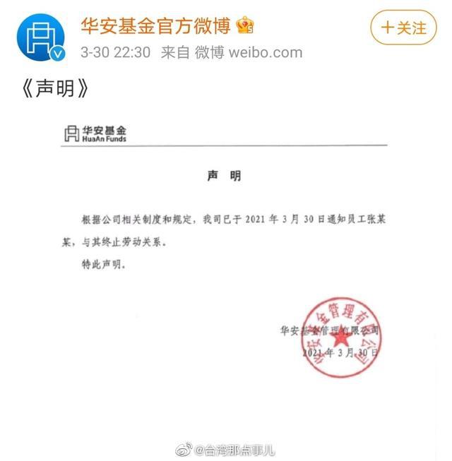 華安基金在昨晚發(fā)表聲明稱,對(duì)任何有損國(guó)家利益和民族感情的行為和言論零容忍,對(duì)相關(guān)言論表示極度震驚和憤慨,并宣布和張女士終止勞動(dòng)關(guān)系。