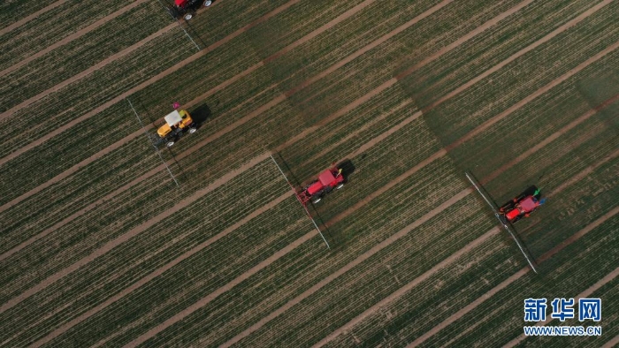噴霧機(jī)在河北省辛集市試炮營(yíng)村麥田里進(jìn)行除草作業(yè)(2020年3月17日攝,無(wú)人機(jī)照片)。