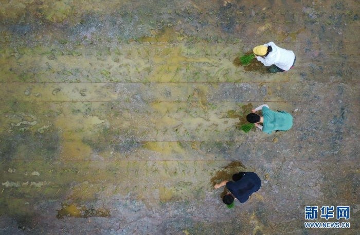 研究人員在廣州增城華南農(nóng)業(yè)大學(xué)試驗(yàn)田插種嫦娥五號(hào)搭載的太空稻秧苗(2021年3月29日攝,無(wú)人機(jī)照片)。共計(jì)40克的“天稻”于2020年11月搭乘嫦娥五號(hào)登月,歷時(shí)約23天、76萬(wàn)公里的“環(huán)月旅行”返回地球。