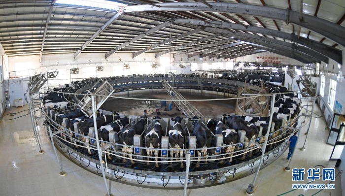 寧夏中衛(wèi)市沐沙牧場(chǎng)的工作人員為自動(dòng)轉(zhuǎn)盤(pán)式奶臺(tái)上的奶牛擠奶(2020年9月14日攝)。寧夏中衛(wèi)市沐沙牧場(chǎng),經(jīng)過(guò)7年時(shí)間,改造沙漠近萬(wàn)畝。昔日數(shù)十米高的流動(dòng)沙丘經(jīng)過(guò)治理改造,變身飼草玉米種植基地,荒蕪的沙地變身“奶牛樂(lè)園”。