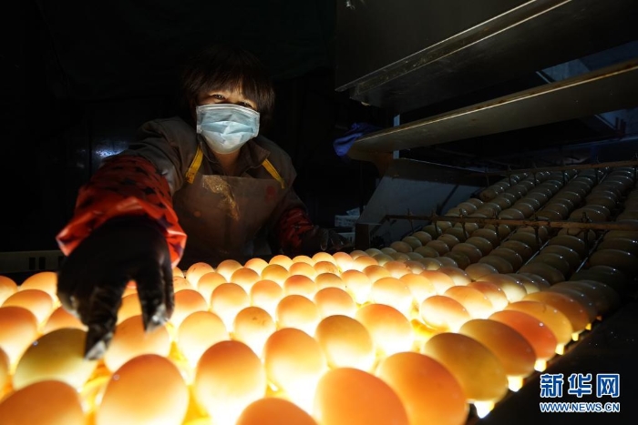 江蘇高郵鴨集團(tuán)的工作人員在生產(chǎn)流水線上對(duì)鴨蛋進(jìn)行光檢作業(yè)(2020年4月15日攝)?!案哙]鴨蛋”是江蘇高郵的特色農(nóng)業(yè)名片。近年來(lái),當(dāng)?shù)卦诹挤N繁育、生態(tài)養(yǎng)殖、產(chǎn)品加工等方面加大力度,推動(dòng)高郵鴨蛋品牌化建設(shè),讓小鴨蛋成為帶動(dòng)農(nóng)戶致富的大產(chǎn)業(yè)。