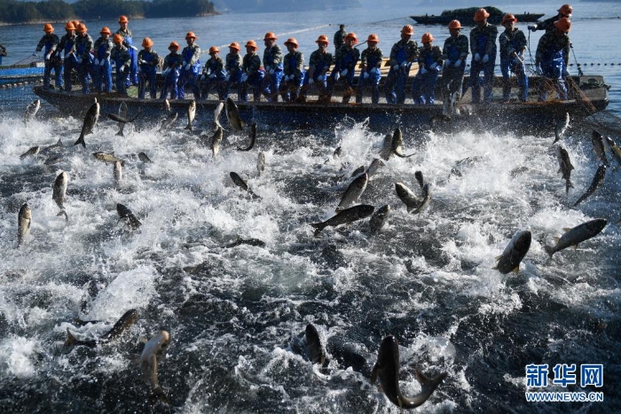 捕撈隊(duì)員在千島湖進(jìn)行巨網(wǎng)捕魚(yú)(2018年11月28日攝)。近年來(lái),千島湖以漁業(yè)為基礎(chǔ),建立了集“養(yǎng)殖、管護(hù)、捕撈、銷(xiāo)售、加工、烹飪、旅游、文創(chuàng)”為一體的完整產(chǎn)業(yè)鏈,獲得經(jīng)濟(jì)效益和生態(tài)效益的雙豐收。