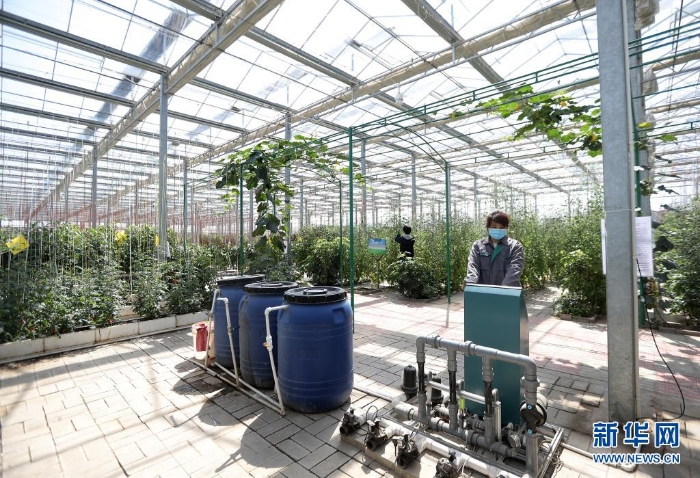 河北省饒陽(yáng)縣一家現(xiàn)代農(nóng)業(yè)示范園區(qū)工人在智慧溫室操作水肥一體化設(shè)施(2020年4月8日攝)。近年來(lái),河北省饒陽(yáng)縣在推進(jìn)農(nóng)業(yè)供給側(cè)結(jié)構(gòu)性改革中,積極優(yōu)化農(nóng)業(yè)產(chǎn)業(yè)結(jié)構(gòu),依托現(xiàn)代農(nóng)業(yè)示范園區(qū)建設(shè),將自動(dòng)滴灌、遠(yuǎn)程數(shù)據(jù)采集、智能電力溫控等先進(jìn)“工業(yè)化”技術(shù)應(yīng)用于農(nóng)業(yè)生產(chǎn)。