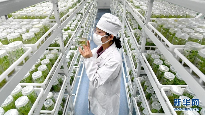陜西省榆林市定邊縣一家馬鈴薯良種繁育基地的技術(shù)人員在組培室里查看馬鈴薯苗(2020年5月30日攝)。近年來(lái),定邊馬鈴薯走上了良種化、集約化、標(biāo)準(zhǔn)化、專(zhuān)業(yè)化的發(fā)展路子,更好地推動(dòng)了當(dāng)?shù)伛R鈴薯產(chǎn)業(yè)的品質(zhì)改善和產(chǎn)量提高,增強(qiáng)了市場(chǎng)競(jìng)爭(zhēng)力。