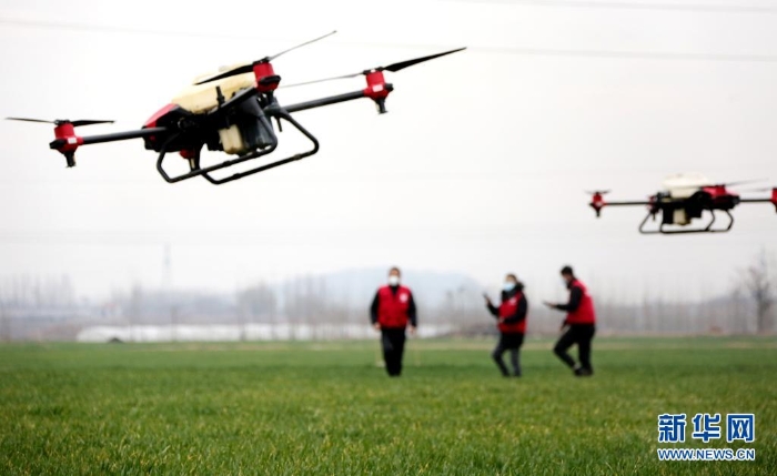在山東省棗莊市市中區(qū)稅郭鎮(zhèn)野崗埠村,工作人員使用植保無(wú)人機(jī)在麥田里噴灑除草劑(2021年2月27日攝)。
