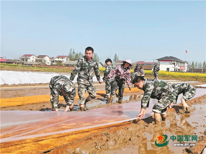 清明前夕,湖南省常德市鼎城區(qū)人武部組織民兵來到十美堂鎮(zhèn),積極協助軍屬集中育秧,助力春耕生產。圖為民兵在戰(zhàn)士栗佳輝家的水田里幫忙育秧。