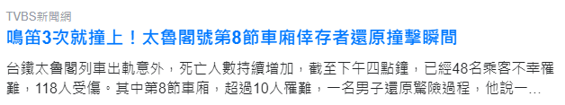 目前死亡人數(shù)已達(dá)48人、118人輕重傷送醫(yī),待送的遺體還有40具。花蓮警方指出,據(jù)統(tǒng)計(jì),目前車廂內(nèi)遺體40具,搬運(yùn)出遺體7具,送醫(yī)不治1人,死者已達(dá)48人,送醫(yī)118人,7人重傷、32人中傷、78人輕傷。
