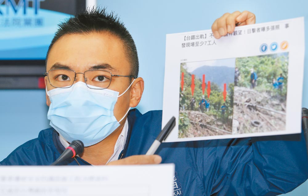 國(guó)民黨“立委”洪孟楷出示媒體報(bào)導(dǎo)內(nèi)容,指出當(dāng)下有工人在山坡上圍觀,其中一人就是李義祥。圖片來(lái)源:臺(tái)灣《中國(guó)時(shí)報(bào)》