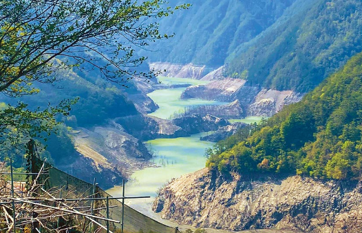 臺灣德基水庫集水區(qū)許久未見豐沛雨量進帳,大甲溪上游河床巖層裸露,出現(xiàn)峽谷枯木地景。圖片來源:臺灣《中國時報》