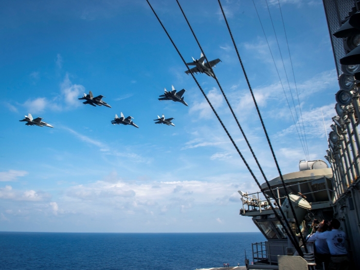 美國太平洋艦隊還公布了“羅斯?!碧柵c馬來西亞皇家空軍戰(zhàn)機聯(lián)合演習的場面,可以看到從“羅斯?!碧柡侥干掀痫w的F/A-18E/F艦載戰(zhàn)斗機與馬來西亞空軍的蘇-30MKM多用途重型戰(zhàn)斗機組成編隊,從“羅斯福”號航母上空飛過。馬來西亞的蘇-30MKM戰(zhàn)斗機由俄羅斯制造,是馬拉西亞最先進的戰(zhàn)斗機之一,這種俄制戰(zhàn)斗機在美軍航母上空飛過的情況并不多見。