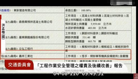 洪孟楷指出,該工程共有6個分包第三方,包括鼎泰祥預拌混泥土有限公司、東興鋼鐵廠股份有限公司、立弘工程行、義祥工業(yè)社、東翔工程行、廣霖鋼鐵有限公司。其中義祥工業(yè)社的工作只有挖掘機、傾卸車等機具設備提供,結果沒有管理好,讓義祥的老板當工地主任,變成本來1/6的廠商只手遮天,整個工程都可以給他負責,所以才會在4月2日一個工地主任跑進去工地。
