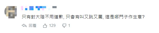 “只有對大陸不用道歉, 只會有叫又跳又罵, 這是哪門子作生意?”有網(wǎng)友說。
