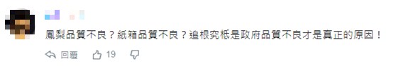 更有網(wǎng)友一針見血稱,“鳳梨品質(zhì)不良?紙箱品質(zhì)不良?追根究底是‘政府’品質(zhì)不良才是真正的原因!”