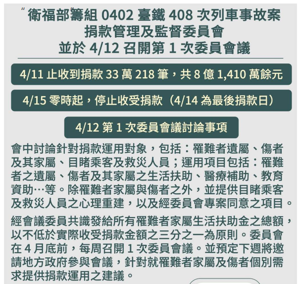 臺(tái)灣衛(wèi)福部門(mén)昨晚在公布太魯閣賑災(zāi)善款金額,并針對(duì)善款公布使用方向。(圖/來(lái)源:臺(tái)灣《中時(shí)電子報(bào)》)