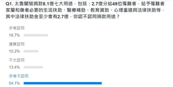 該民調(diào)調(diào)詢(xún)問(wèn)網(wǎng)友,“太魯閣號(hào)捐款8.1億七大用途,包括:2.7億分給49位罹難者,給予罹難者家屬和傷者必要的生活扶助、醫(yī)療補(bǔ)助、教育資助、心理重建與法律扶助等,其中法律扶助金至少會(huì)有2.7億,你認(rèn)不認(rèn)同捐款用途?”,結(jié)果顯示,表示非常認(rèn)同的網(wǎng)友有16.7%,還算認(rèn)同的有10.2%,不太認(rèn)同的有13.4%,非常不認(rèn)同的則有54.1%,另外有5.6%網(wǎng)友沒(méi)表示明確意見(jiàn)。